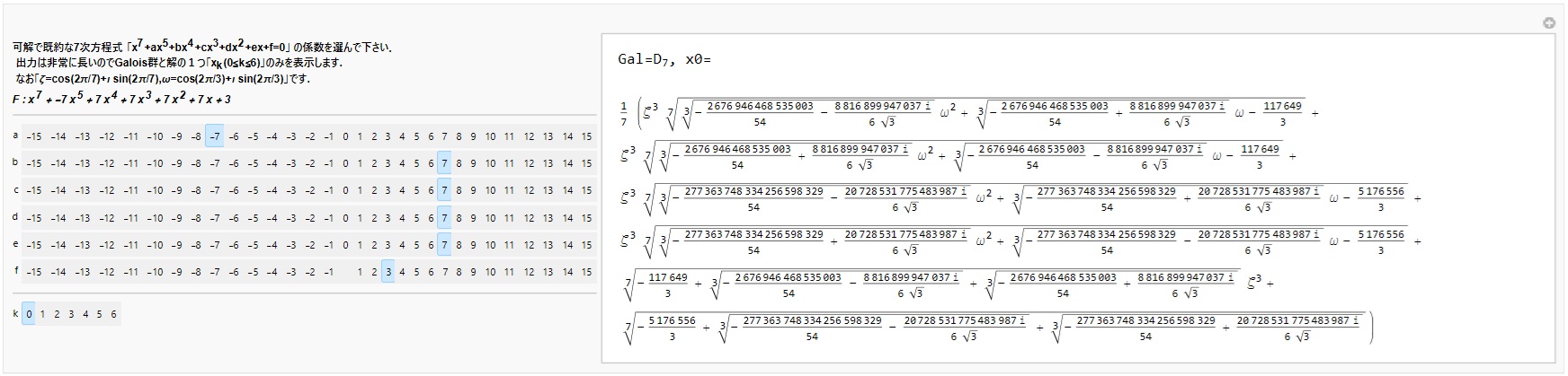 Mathematicaで 5次以下の方程式のガロア群や,5次,7次方程式の解を求めるプログラムを書きました.もちろん5次以上の方程式の解の公式は存在しないので,可解な方程式のみです.(解の公式は無くとも